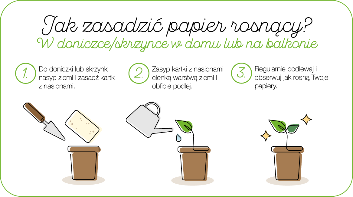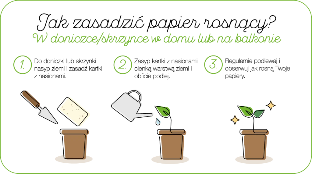 Arkusz papieru można podzielić na mniejsze kawałki, ułożyć je w doniczce i przysypać cienką warstwą ziemi. Po posadzeniu należy doniczkę obficie podlać i ustawić w ciepłym, widnym miejscu. Teraz wystarczy już tylko cierpliwie czekać i obserwować jak nasz papier rośnie 😉
